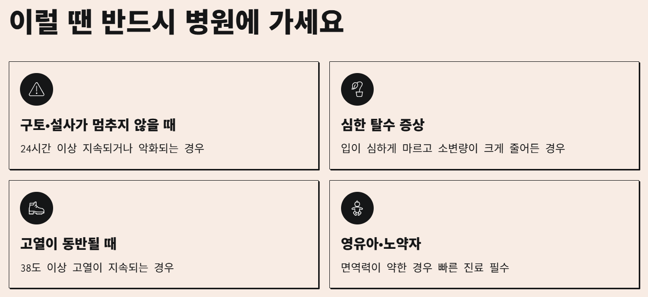 구토나 설사가 멈추지 않거나 탈수 증상이 보이면 반드시 병원 진료가 필요합니다.