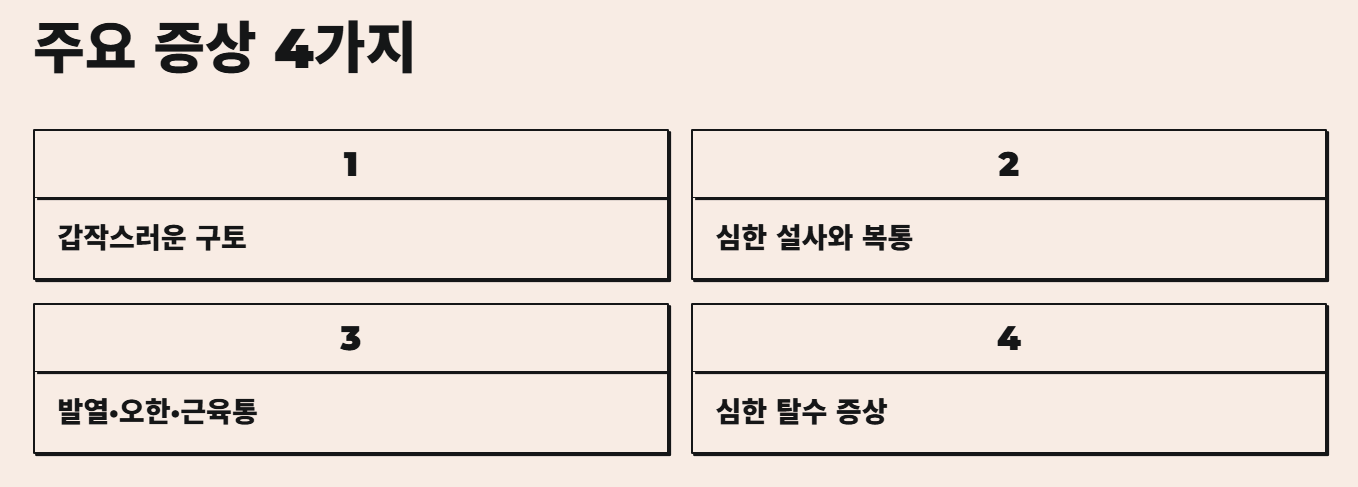 물처럼 묽은 설사가 하루에도 여러 차례 나타날 수 있으며, 배를 쥐어짜는 듯한 복통이 동반되기도 합니다. 단순한 배탈보다 통증과 설사의 강도가 더 심한 경우가 많습니다. 설사와 복통이 동시에 나타나고 빠르게 악화된다면 단순 소화불량이 아닐 가능성이 큽니다.