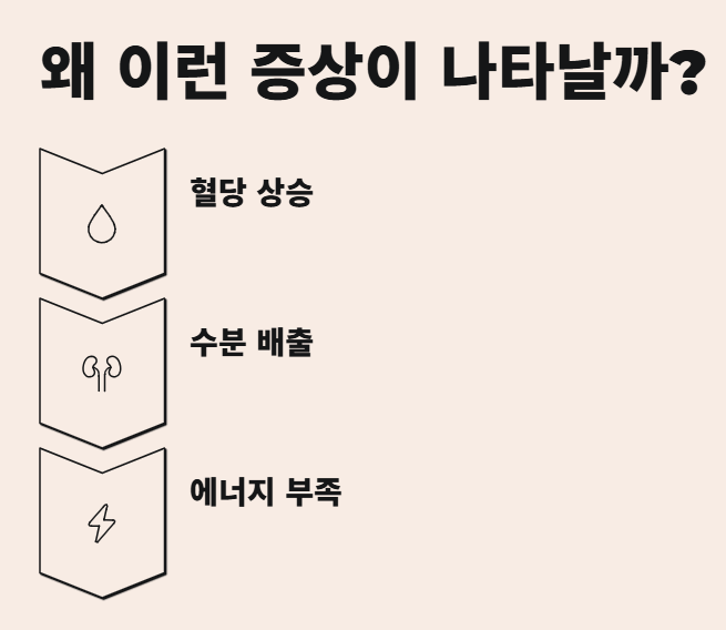 당뇨병은 혈액 속 포도당이 제대로 조절되지 않는 상태입니다. 혈당이 높아지면 몸은 이를 소변으로 배출하려고 하고, 그 과정에서 수분이 함께 빠져나가면서 갈증과 잦은 소변이 생깁니다. 또한 세포가 포도당을 제대로 사용하지 못해 에너지가 부족한 상태가 되면서 쉽게 피로해지고 체중 감소가 나타날 수 있습니다.