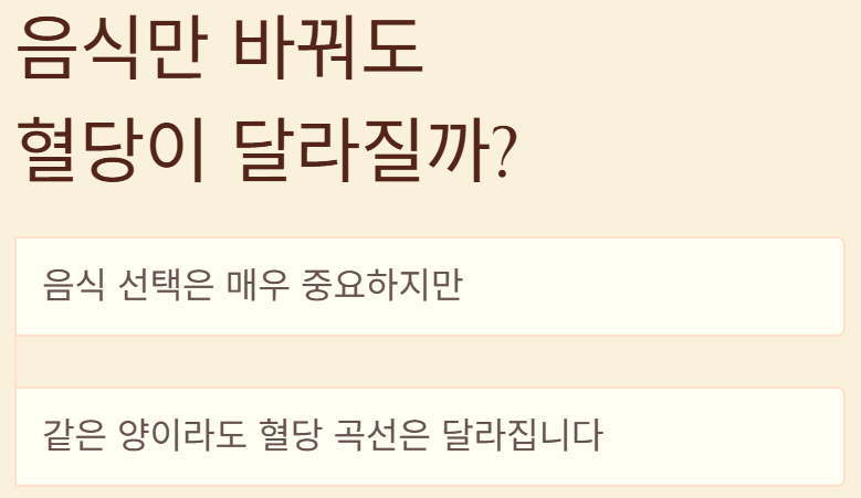다만 같은 열량·같은 양이라도 음식 선택에 따라 혈당 곡선은 크게 달라질 수 있습니다. 그래서 ‘무엇을 먹느냐’가 중요한 것입니다.