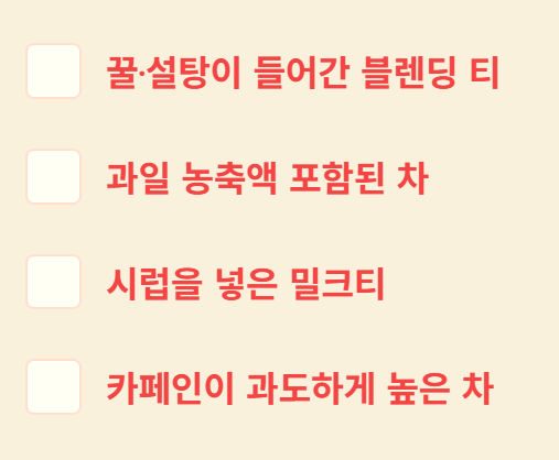‘차’라는 이름이 붙어 있어도, 당이나 시럽이 들어가면 혈당 음료와 다르지 않다 는 점을 꼭 기억해야 합니다.