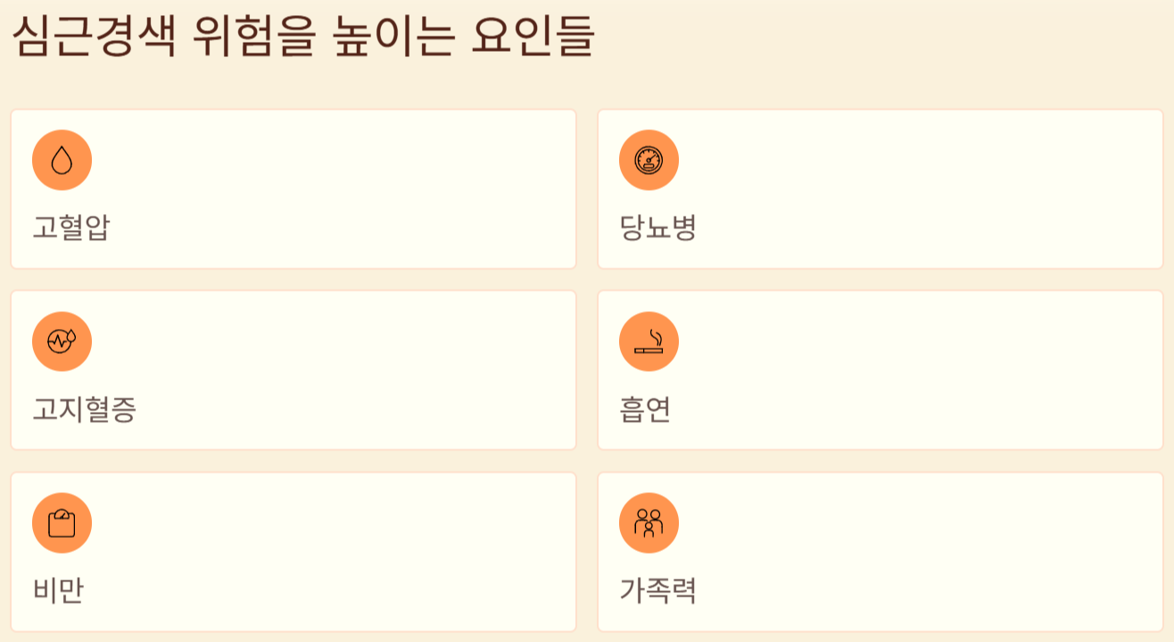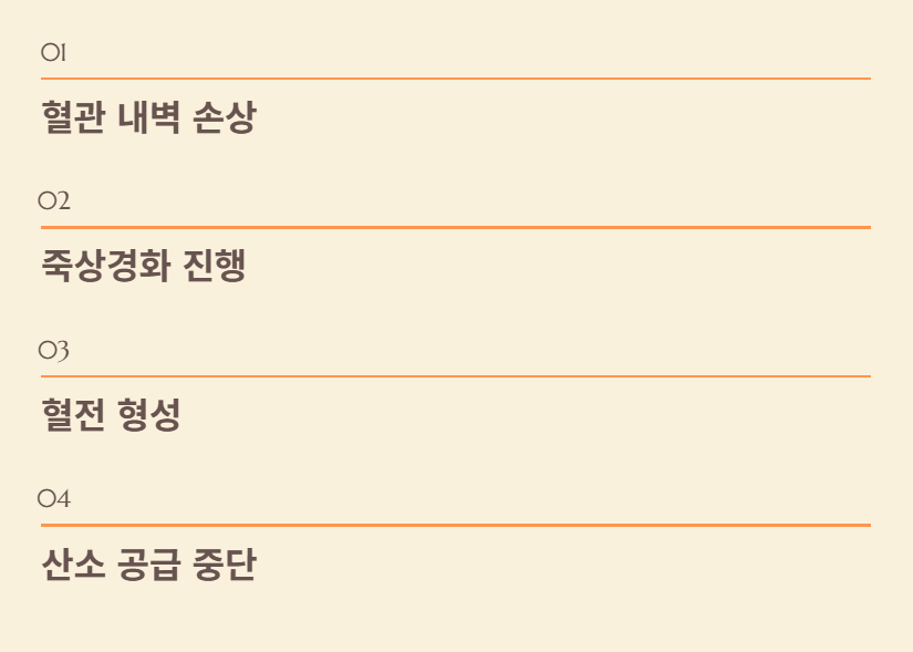 심근경색은 심장 근육에 혈액을 공급하는 관상동맥이 혈전이나 죽상경화로 갑자기 막히면서 발생합니다. 혈관이 막히는 순간 심장 근육으로 가는 산소 공급이 중단되고, 짧은 시간 안에 심장 근육 손상이 시작됩니다. 심근경색은 시간이 지날수록 손상 범위가 빠르게 커지는 질환입니다. 그래서 ‘얼마나 빨리 병원에 도착했는지’가 치료 결과를 결정합니다. 특히 고혈압, 당뇨, 고지혈증, 흡연, 비만, 가족력이 있는 경우 혈관 내벽이 이미 약해져 있어 심근경색 위험이 더 높아집니다.
