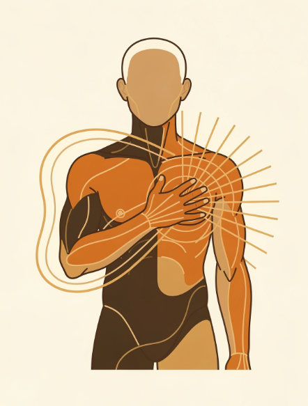 협심증 통증은 가슴에만 국한되지 않고 왼쪽 어깨, 팔, 목, 턱, 등으로 퍼지는 경우도 적지 않습니다. 이 때문에 목디스크나 오십견으로 오해하는 경우도 많습니다. 가슴 통증이 거의 없더라도 팔이나 턱 통증이 활동 시 나타난다면 심장 문제를 배제해서는 안 됩니다.