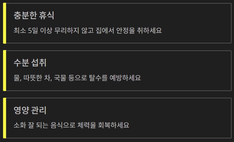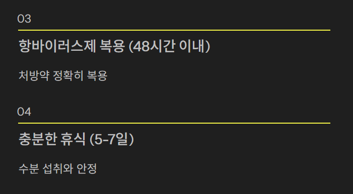 독감은 항바이러스제를 복용하면 증상 기간을 줄이고 합병증 위험을 낮출 수 있습니다. 다만 증상 발생 후 48시간 이내에 시작하는 것이 가장 효과적입니다. 독감 치료의 핵심은 ‘버티기’가 아니라 ‘초기 대응’입니다. 회복 기간은 개인차가 있지만 보통 5~7일 정도이며, 기침과 피로감은 그 이후까지 남을 수 있습니다. 충분한 휴식과 수분 섭취가 회복을 앞당깁니다.