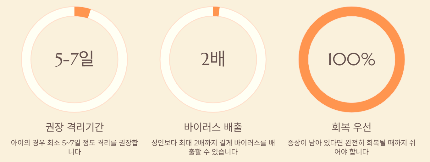 아이의 경우 성인보다 바이러스 배출 기간이 더 길어질 수 있어 격리 기간을 더욱 신중하게 잡는 것이 중요합니다. 특히 어린이집이나 학교 등 집단생활을 하는 경우라면 더욱 그렇습니다. 아이의 경우 최소 5~7일 정도 격리를 권장하는 경우가 많습니다. 증상이 남아 있다면 기간이 더 늘어날 수 있습니다. 무리하게 등원이나 등교를 시키면 회복이 늦어질 뿐 아니라 학급 내 집단 감염으로 이어질 수 있습니다.