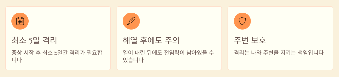 격리는 ‘나를 위한 휴식’이 아니라 ‘주변을 지키는 책임’이라는 점을 꼭 기억해야 합니다.